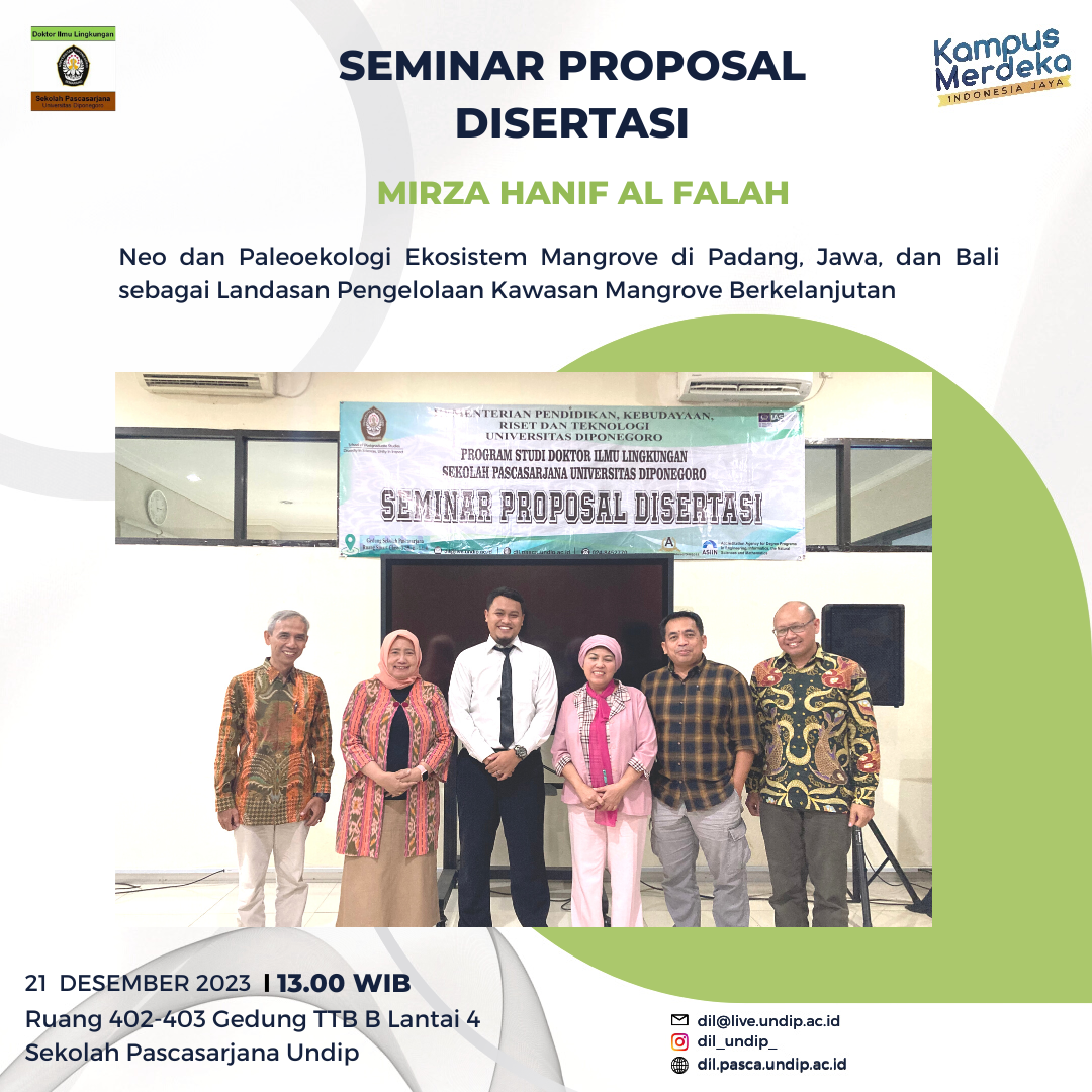 Telah berlangsung hari ini Seminar Proposal Disertasi mahasiswa Doktor Ilmu Lingkungan Sekolah Pascasarjana Undip a.n. Mirza Hanif Al Falah dengan judul disertasi “Neo dan Paleoekologi Ekosistem Mangrove di Padang, Jawa, dan Bali sebagai Landasan Pengelolaan Kawasan Mangrove Berkelanjutan.”