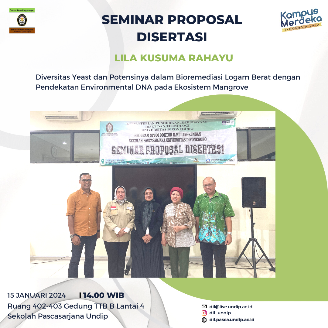 Telah berlangsung hari ini Seminar Proposal Disertasi mahasiswa Doktor Ilmu Lingkungan Sekolah Pascasarjana Undip a.n. Lila Kusuma Rahayu dengan judul disertasi “Diversitas Yeast dan Potensinya dalam Bioremediasi Logam Berat dengan Pendekatan Environmental DNA pada Ekosistem Mangrove.”