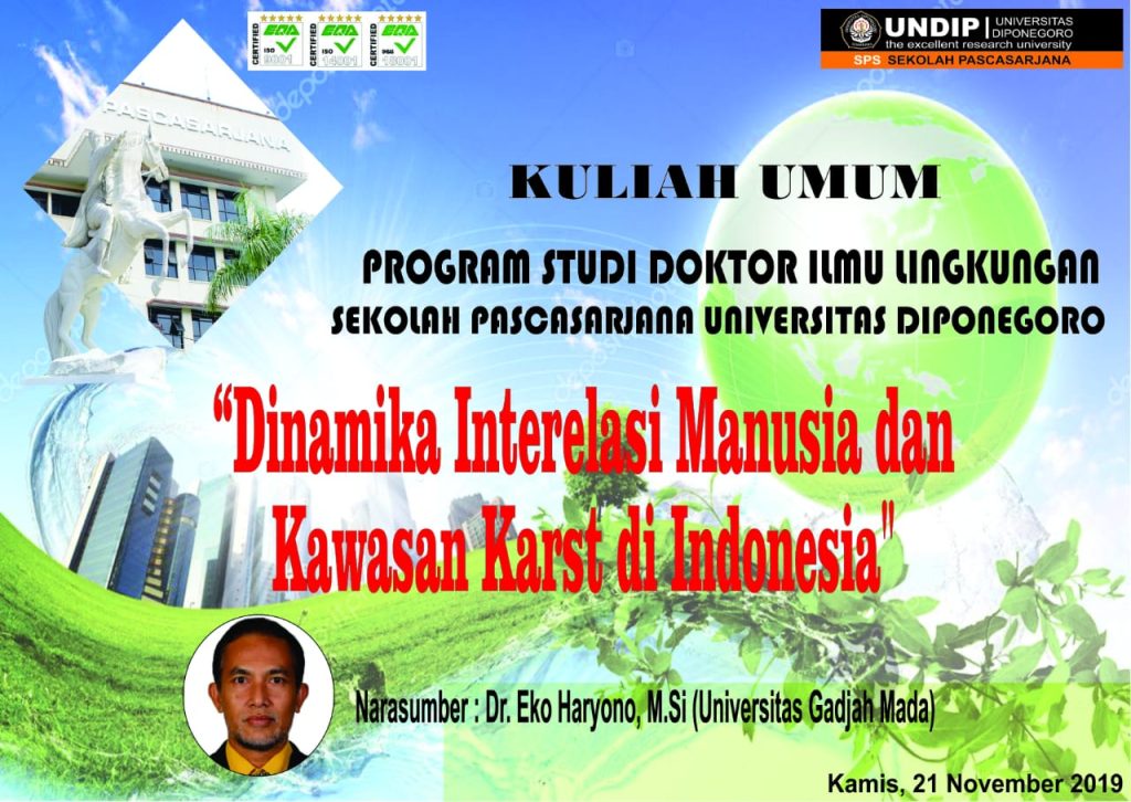 Program Studi Doktor Ilmu Lingkungan Sekolah Pascasarjana Universitas Diponegoro kembali menyelenggarakan Kuliah Umum pada Kamis, 21 November 2019 jam 10.00-14.00 WIB. Kuliah Umum ini menghadirkan narasumber dari Universitas Gajah Mada yaitu Dr. Eko Haryono, M.Si dengan mengusung tema “Dinamika Interelasi Manusia dan Kawasan Karst di Indonesia”.