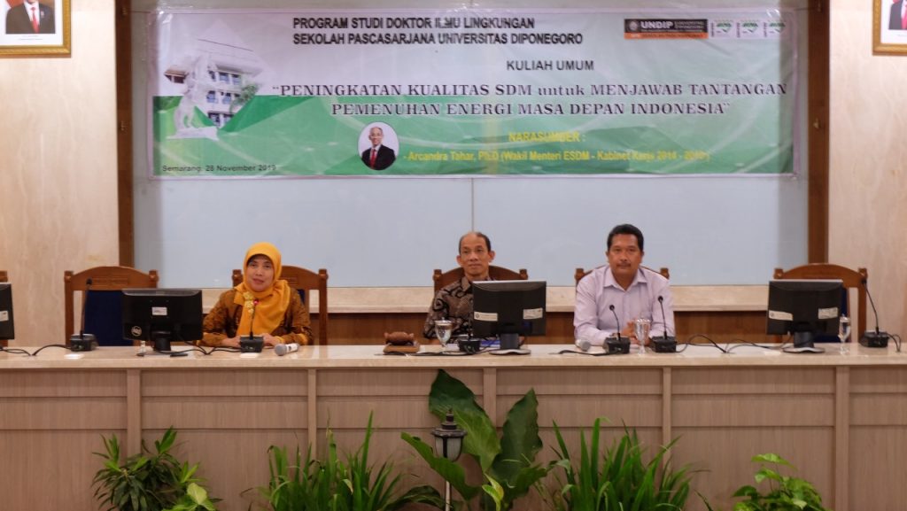 Program Studi Doktor Ilmu Lingkungan Sekolah Pascasarjana UNDIP kembali menyelenggarakan acara Kuliah Umum dengan tema “Peningkatan Kualitas SDM untuk Menjawab Tantangan Pemenuhan Energi Masa Depan Indonesia”.