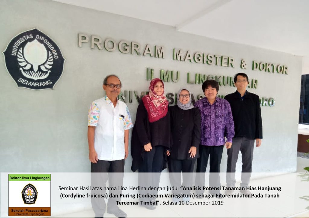 Program Studi Doktor Ilmu Lingkungan Sekolah Pascasarjana Universitas Diponegoro telah melaksanakan Ujian Disertasi Doktor mahasiswa atas nama Lina Herlina dengan judul disertasi “Analisis Potensi Tanaman Hias Hanjuang (Cordyline fruicosa) dan Puring (Codiaeum Variegatum) sebagai Fitoremidiator pada Tanah Tercemar Timbal”