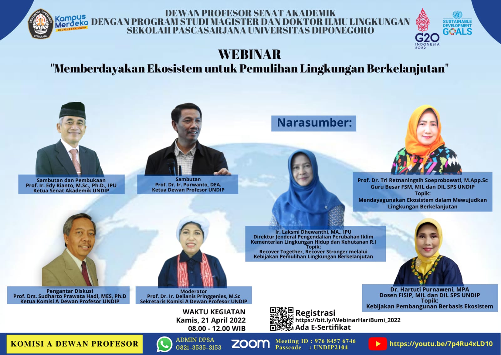 In commemoration of Earth Day and Kartini Day, the Board of Professors of the Academic Senate with the Master and Doctoral Study Program in Environmental Sciences at Undip Postgraduate School held a webinar with the theme “Empowering Ecosystems for Sustainable Environmental Restoration.” This webinar will take place online on April 21, 2022 via Zoom Meeting.