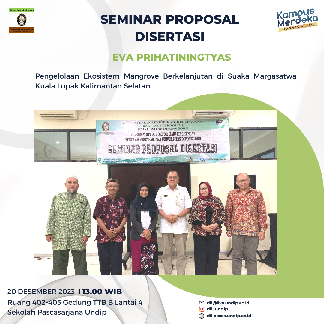 Today, Seminar of Dissertation Proposal Eva Prihatiningtyas is held in Doctoral Program of Environmental Science. The title of dissertation entitled “Pengelolaan Ekosistem Mangrove Berkelanjutan di Suaka Margasatwa Kuala Lupak Kalimantan Selatan.”