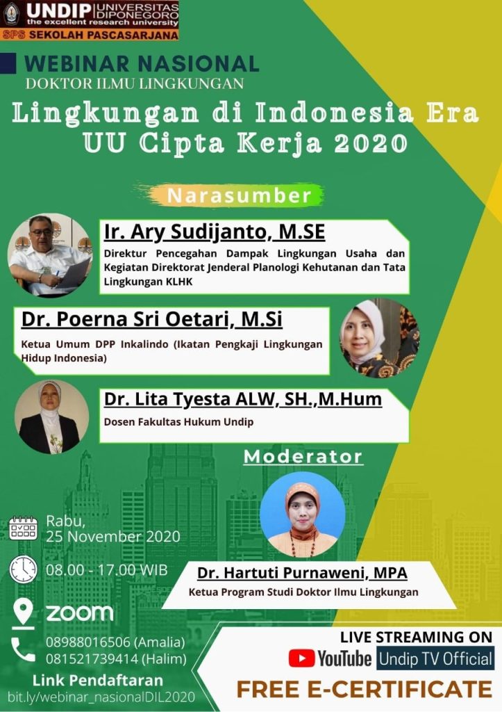 National Webinar with the theme: “Environment in Indonesia in the Era of the 2020 Job Creation Law” organized by: Environmental Science Doctoral Study Program, Postgraduate School, Diponegoro University, Semarang, November 25, 2020